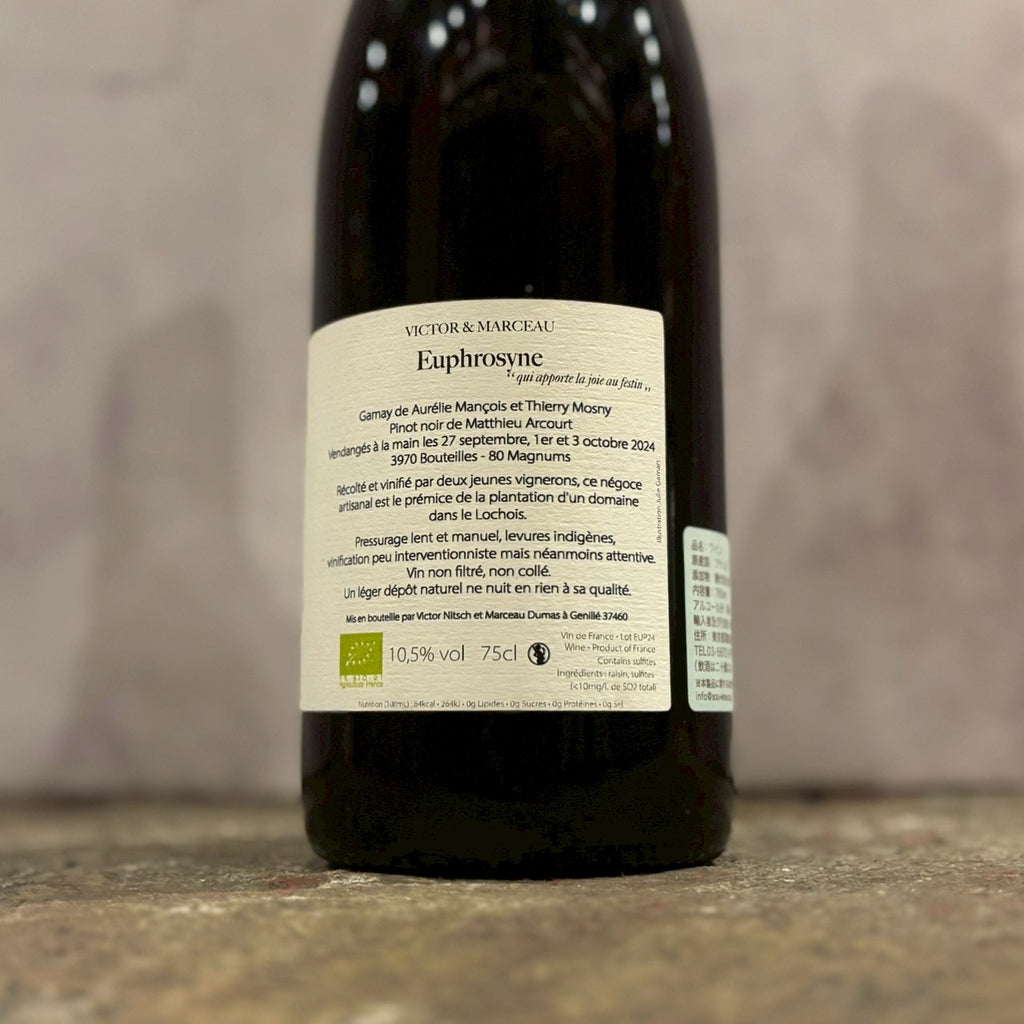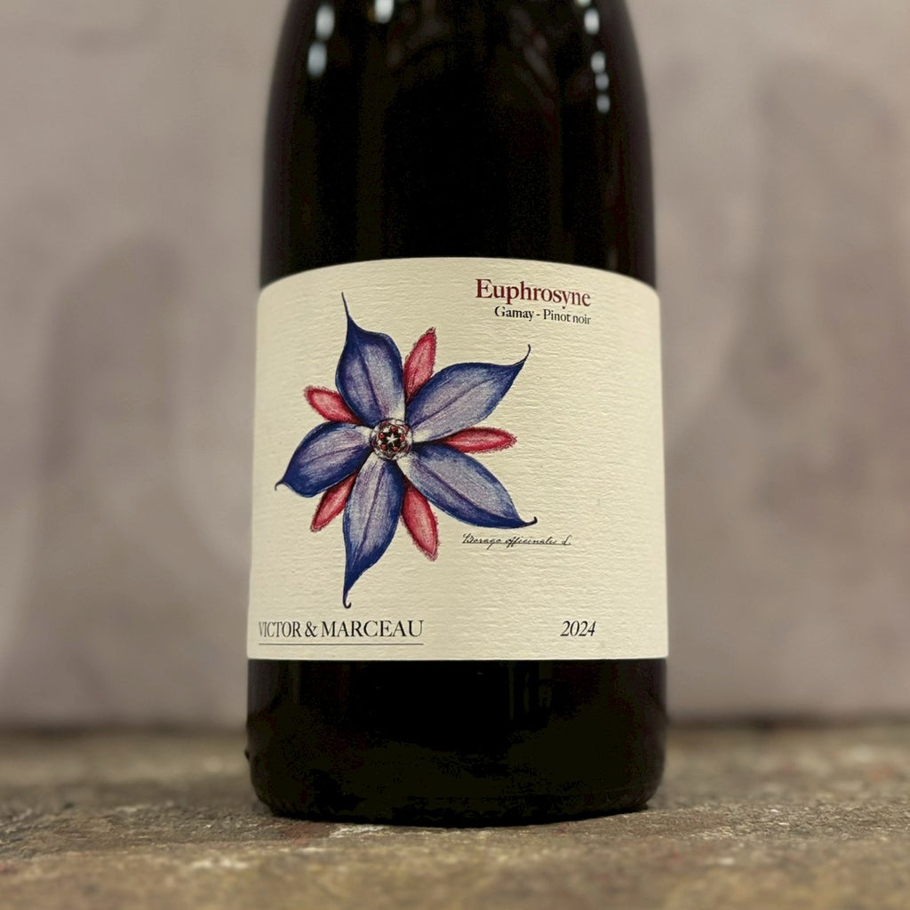 ガメイは3週間、ピノ・ノワールは1週間のマセラシオン。圧搾後にブレンドし古樽に移し1年熟成。ラベルに描かれている花は、Bourrache(ボラッシュ)で、古代ギリシャ人はこれをワインに漬け込み、ギリシャ語で 「宴に喜びをもたらすもの 」を意味する”Euphrosyne”と呼んでいました。淡く綺麗な薄めのルビー色。グラスに注いだ瞬間は還元のニュアンスが少々ありますが、全く嫌味がなく、すぐに瑞々しく甘い果実の香りが上がってきます。口に含んでも瑞々しさはそのままに、ザクロやイチジクのような果実感、溶け込んだウエットなタンニンと旨味を含んだ綺麗な酸。バランスが良く、スルスルと飲みすすめられるストレスフリーな飲み心地です。